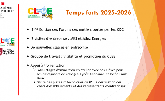 Cette semaine s’est tenue la quatrième et dernière réunion du Groupe de Travail 2023-2024 dans le cadre du CLEE Charente Limousine. Les travaux de l’année portent sur la structuration du Parcours Avenir, dans le but de faciliter sa construction par les chefs d’établissement, et de favoriser la participation des entreprises […]